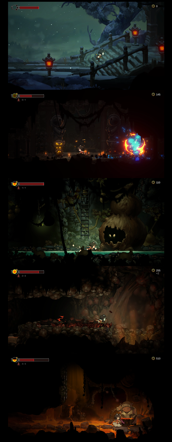 在游戏中玩家可以操作主角做出移动,跳跃,二段跳,冲刺,攀爬,悬挂,连击,使用灵力等诸多动作。