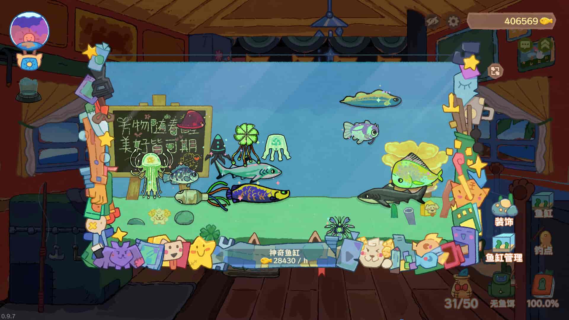 将钓到的鱼放入鱼缸,静静欣赏它们悠闲游动的身姿,同时还能获得额外收益。升级鱼缸,扩展空间,让你的鱼缸变得更加丰富!