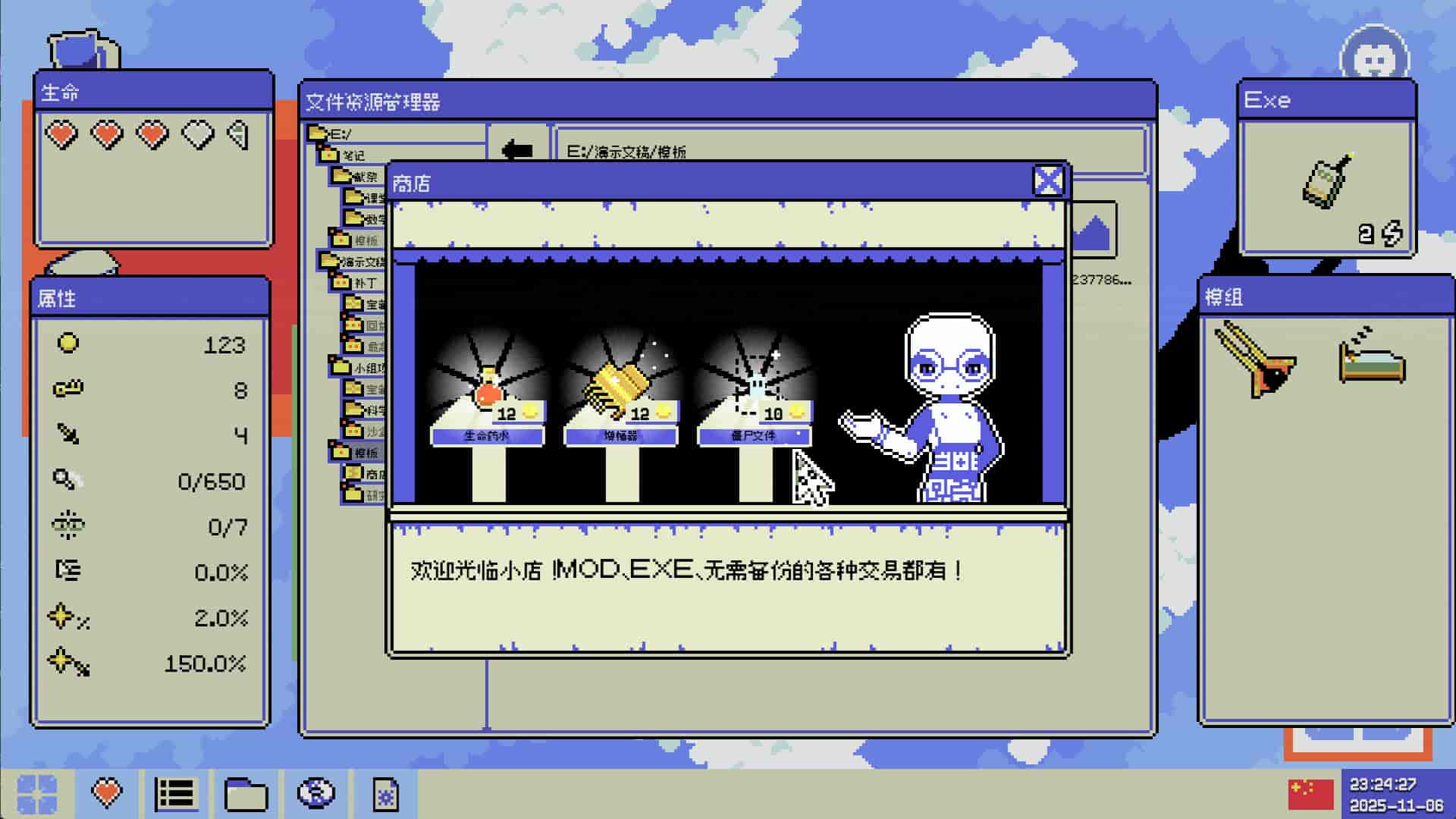 电脑中的文件夹化作了危机四伏的地下城,文件中隐藏着秘密、宝藏与杀机。你将穿梭于随机生成的关卡,并发掘能助你一臂之力的强大EXE程序,击退源源不断试图阻挡你前进道路的病毒。