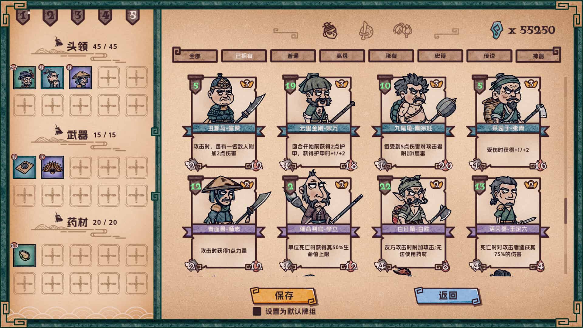 《水浒绘卷》是一款刷宝加小队构筑的回合制战斗游戏。通过在关卡中收集不同品质的英雄、武器、药材来构筑你的专属牌组,以战胜强大的敌人。